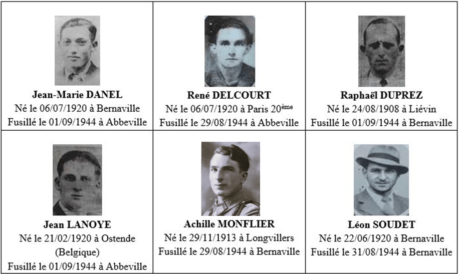 Des cris fusent de toute part, des coups de feu retentissent cherchant à abattre ceux qui veulent s’enfuir. Vingt-six hommes sont arrêtés et emmenés dans la cour de la Mairie. Parmi eux se trouvent Achille MONFLIER, Jean-Marie DANEL, Léon SOUDET, Jean LANOYE, René DELCOURT et Raphaël DUPREZ. Ils sont résistants au sein du FTP de la SOMME (francs-tireurs et partisans) et du FFI (forces françaises de l’intérieur). Ils ont peur ces hommes courageux qui se battent pour notre patrie. Ils savent ce qui les attend.