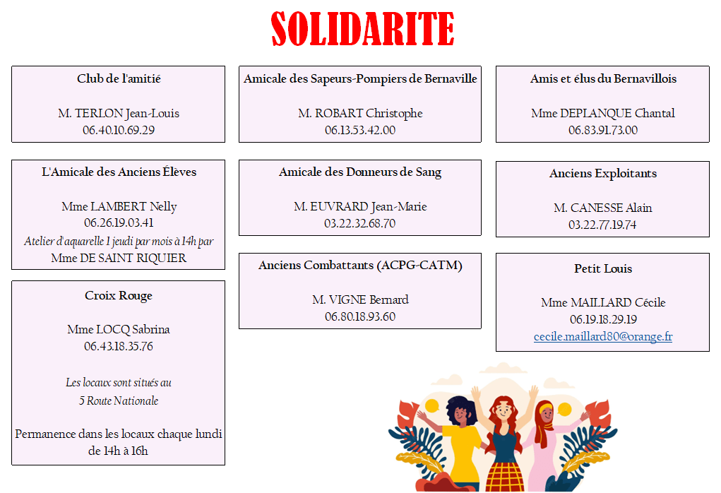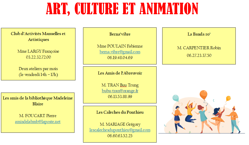 Toutes les associations de BERNAVILLE à retrouver ici. Vous souhaitez en apprendre plus sur les associations de la commune ? Contactez l’élue en charge, Mme Valérie BOULANGER via le secrétariat de mairie.